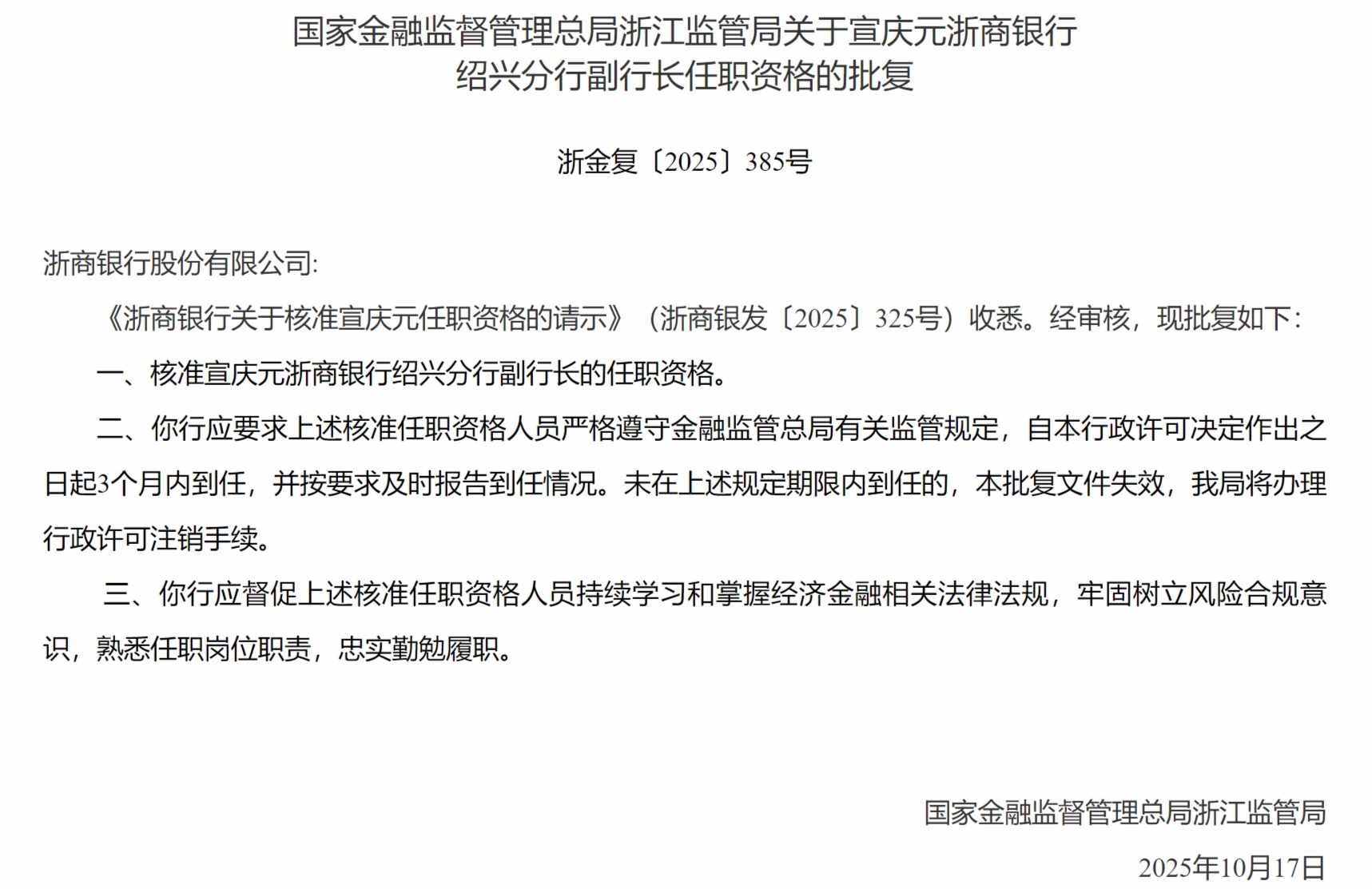 10月22日,国家金融监督管理总局浙江监管局发布关于宣庆元浙商银行绍兴分行副行长任职资格的批复,核准宣庆元浙商银行绍兴分行副行长的任职资格。