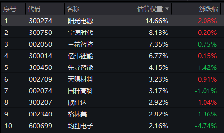 电池50ETF(159796)标的指数成分股涨跌不一,阳光电源涨超2%,欣旺达涨超1%,宁德时代、亿纬锂能微涨,格林美、国轩高科等跌超1%,南网科技、均胜电子跌等跌幅居前。