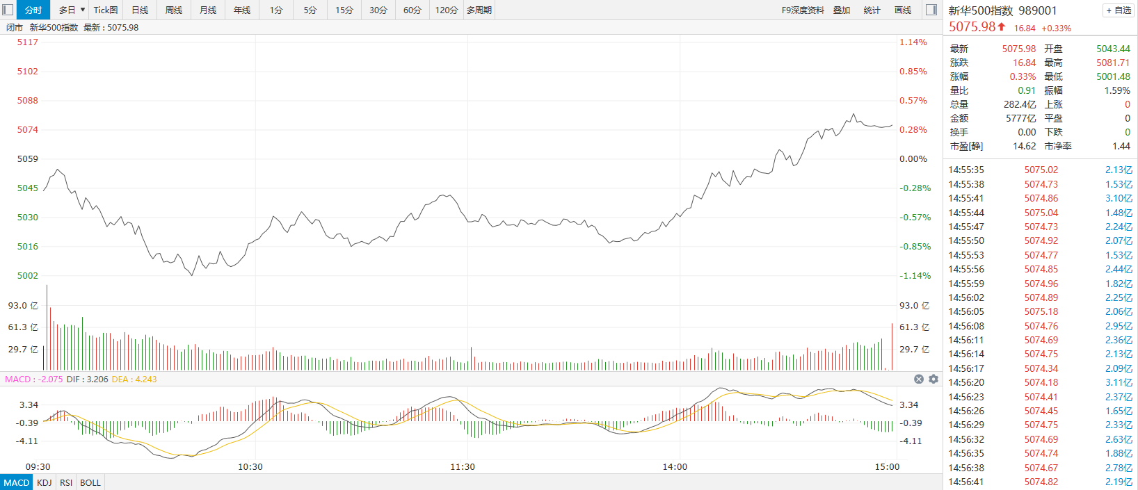 新华财经北京10月23日电(罗浩)新华500指数(989001)10月23日收盘上涨16.84点,涨幅0.33%,报5075.98点。