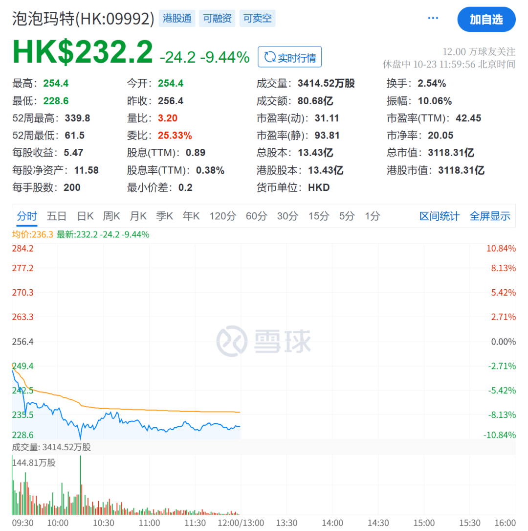 10月23日上午,港股泡泡玛特开盘后大幅走低,盘中股价最低跌至228.6港元/股,跌幅达10.84%,刷新近期低点。截至午间收盘,泡泡玛特报232.2港元/股,跌超9%。