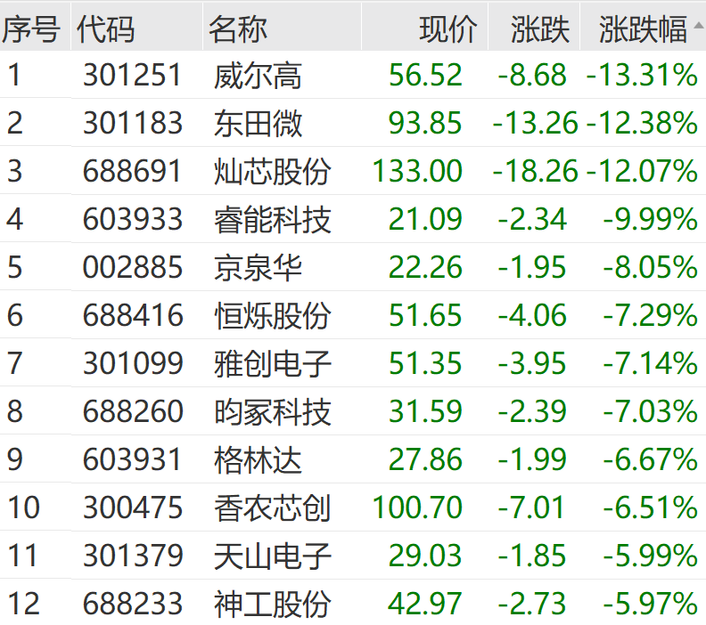 威尔高、东田微、灿芯股份等跌超10%,睿能科技跌停,香农芯创、深南电路、东山精密、兆易创新等均有明显跌幅。