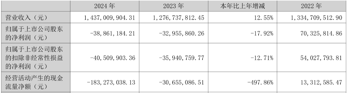 2024年,公司实现营业收入14.37亿元,同比增长12.55%;归属于上市公司股东的净利润为-3,886.12万元,上年同期为-3,295.59万元;归属于上市公司股东的扣非净利润为-4,050.99万元,上年同期为-3,594.08万元;经营活动产生的现金流量净额为-1.83亿元,上年同期为-3,065.51万元。