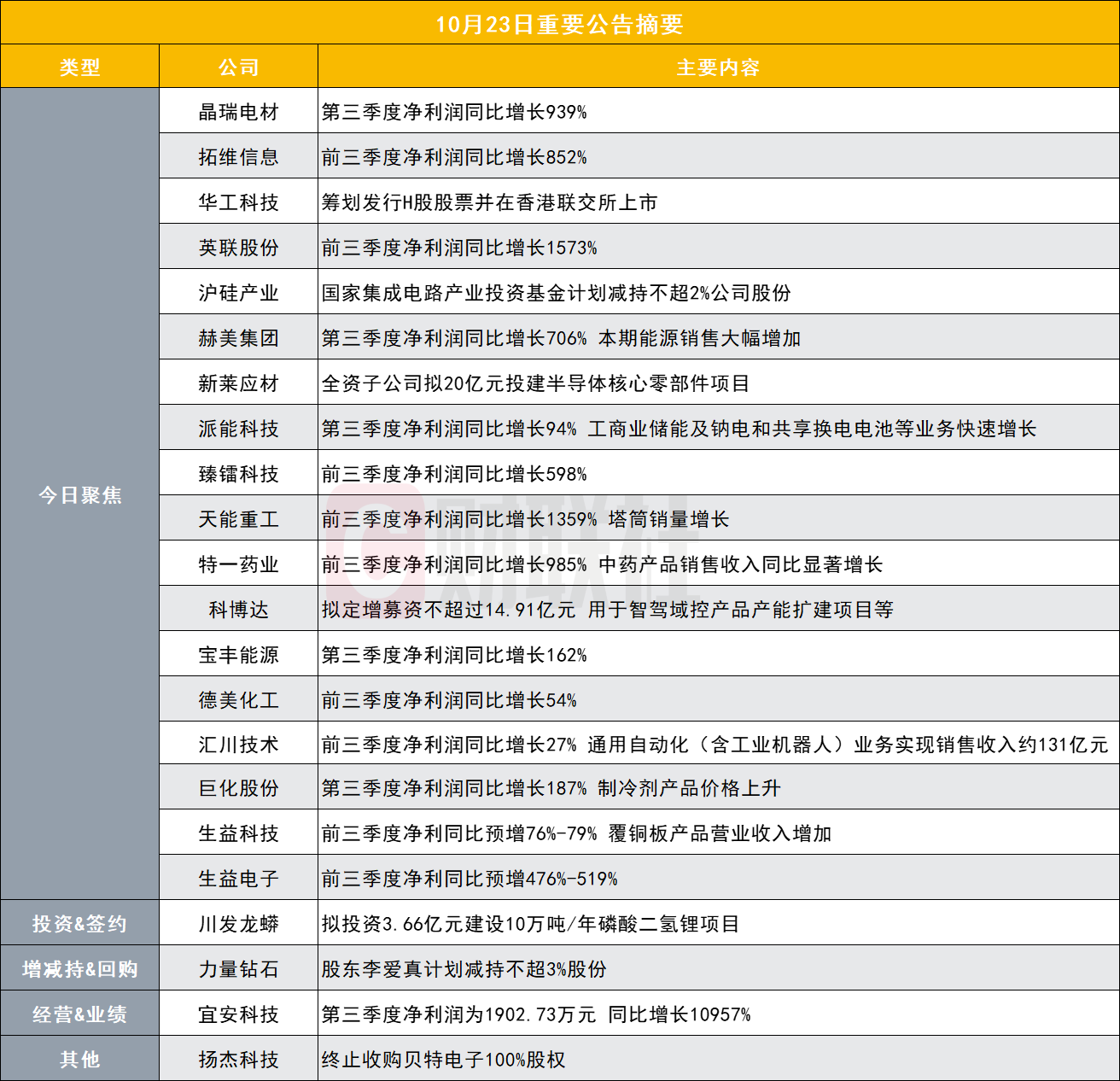 前三季度净利同比增长超192倍 150亿光刻胶概念股三季报出炉|盘后公告集锦