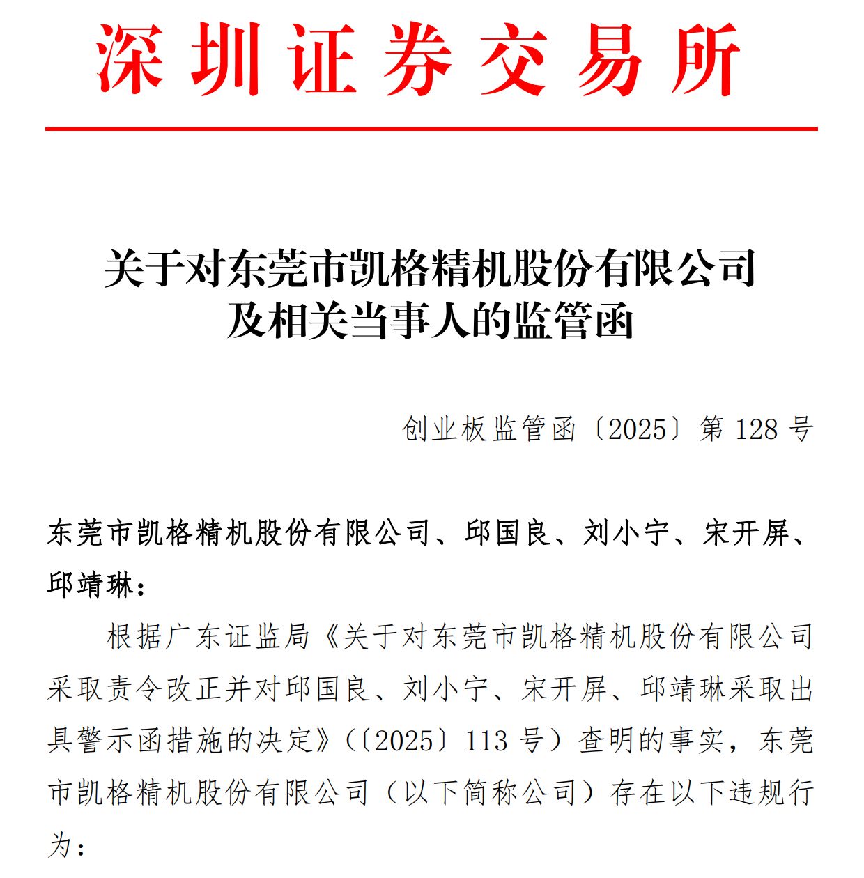 10月23日晚间,凯格精机(301338.SZ,股价64.79元,市值68.94亿元)公告称,近日分别收到中国证监会广东监管局(以下简称“广东证监局”)和深交所向公司及相关责任人下发的行政监管措施决定书和监管函。