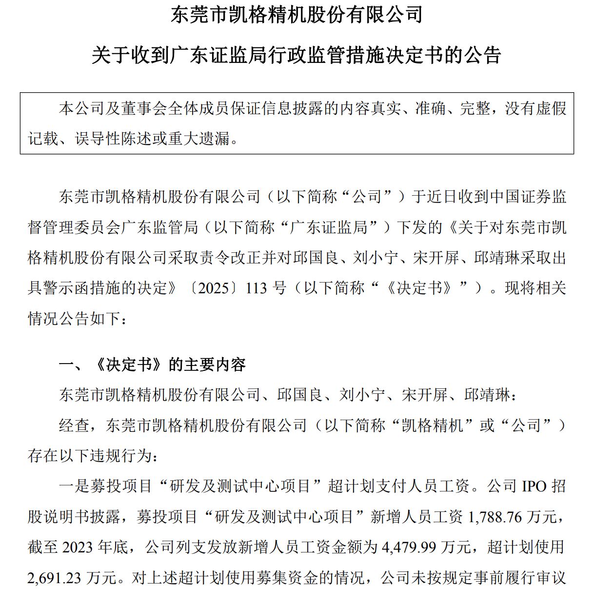 公告显示,经查明,凯格精机在对IPO募集资金的使用上,存在两大具体违规事实。