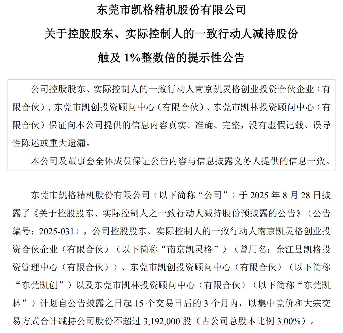 公告显示,凯格精机控股股东、实际控制人邱国良的一致行动人——南京凯灵格创业投资合伙企业(有限合伙)(以下简称“南京凯灵格”)、东莞市凯创投资顾问中心(有限合伙)(以下简称“东莞凯创”)和东莞市凯林投资顾问中心(有限合伙)(以下简称“东莞凯林”)计划自公告披露之日起15个交易日后的3个月内(即2025年9月19日至12月18日),通过集中竞价交易和大宗交易方式合计减持公司股份不超过319.2万股,占公司总股本的3.00%。减持原因是“基于平台员工个人资金需求”。