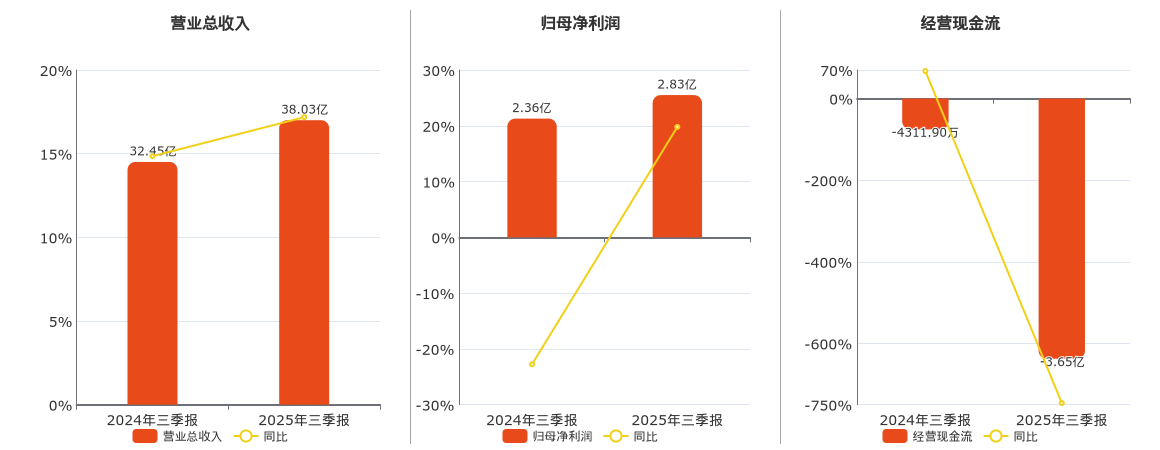 公司营业总收入为38.03亿元。归母净利润为2.83亿元。经营活动现金净流入为-3.65亿元,较去年同报告期经营活动现金净流入减少3.22亿元。