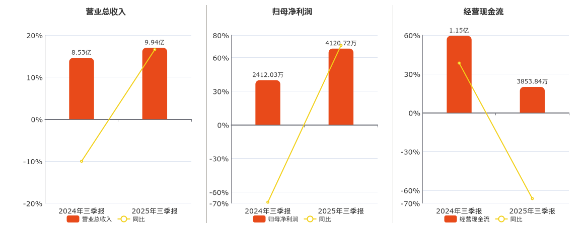 公司营业总收入为9.94亿元。归母净利润为4120.72万元。经营活动现金净流入为3853.84万元,较去年同报告期经营活动现金净流入减少7623.23万元,同比较去年同期下降66.42%。