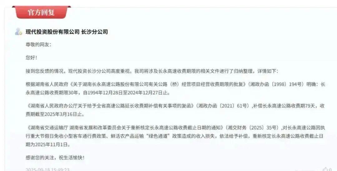 面对一些市民的疑问,现代投资股份有限公司长沙分公司对“长永高速收费期限”的相关问题进行了官方回复。根据湖南省人民政府《关于湖南长永高速公路股份有限公司有关公路(桥)经营项目经营收费期限的批复》(湘政办函(1998)194号)明确:长永高速公路收费期限30年,自1994年12月28日至2024年12月27日止。