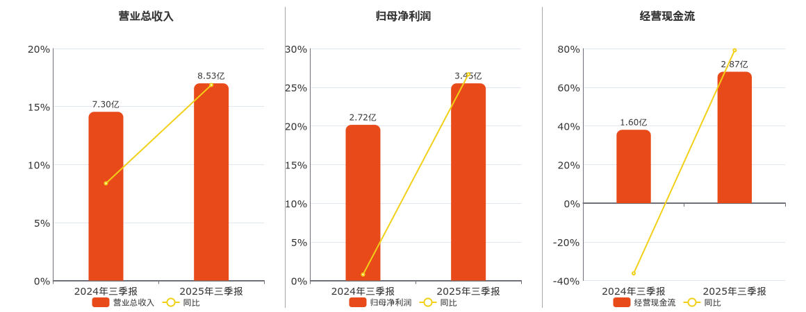 公司营业总收入为8.53亿元。归母净利润为3.45亿元。经营活动现金净流入为2.87亿元。