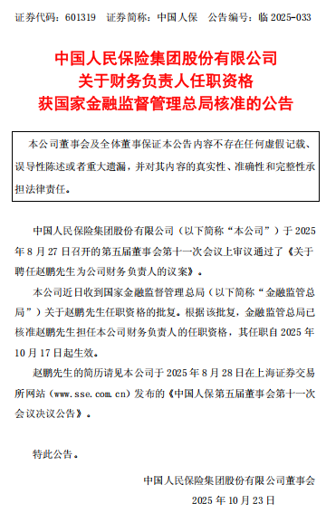 10月23日,中国人民保险集团股份有限公司发布关于财务负责人任职资格获国家金融监督管理总局核准的公告,金融监管总局已核准赵鹏先生担任本公司财务负责人的任职资格。