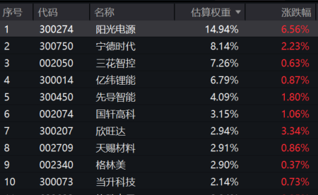 电池50ETF(159796)标的指数成分股多数冲高,阳光电源大涨超6%,欣旺达涨超3%,宁德时代涨超2%,先导智能涨超1%,三花智控、亿纬锂能等强势跟涨。