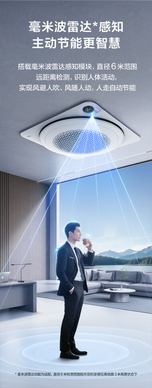 同时,TCL小蓝翼天花机搭载了毫米波雷达感知模块(选配模块),能够在直径6米范围内远距离识别人体活动,实现风避人吹、风随人动。当人离开房间时,空调会自动进入节能模式,实现主动节能,更加智慧高效。