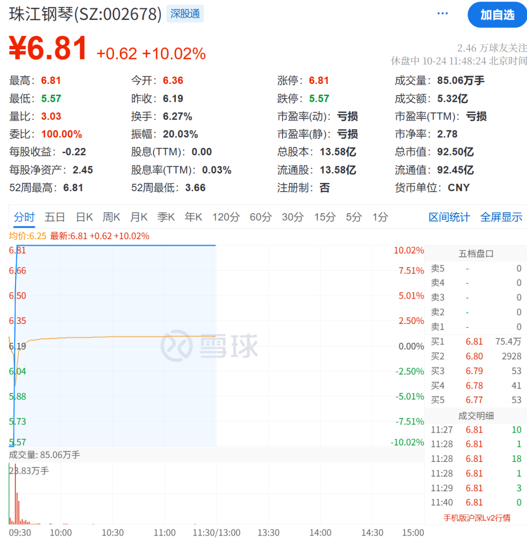 10月24日,珠江钢琴盘初跌停,随后直线拉升,光速完成“地天板”。截至午间收盘,珠江钢琴仍保持涨停状态,股价为6.81元/股,买一达75.4万手。