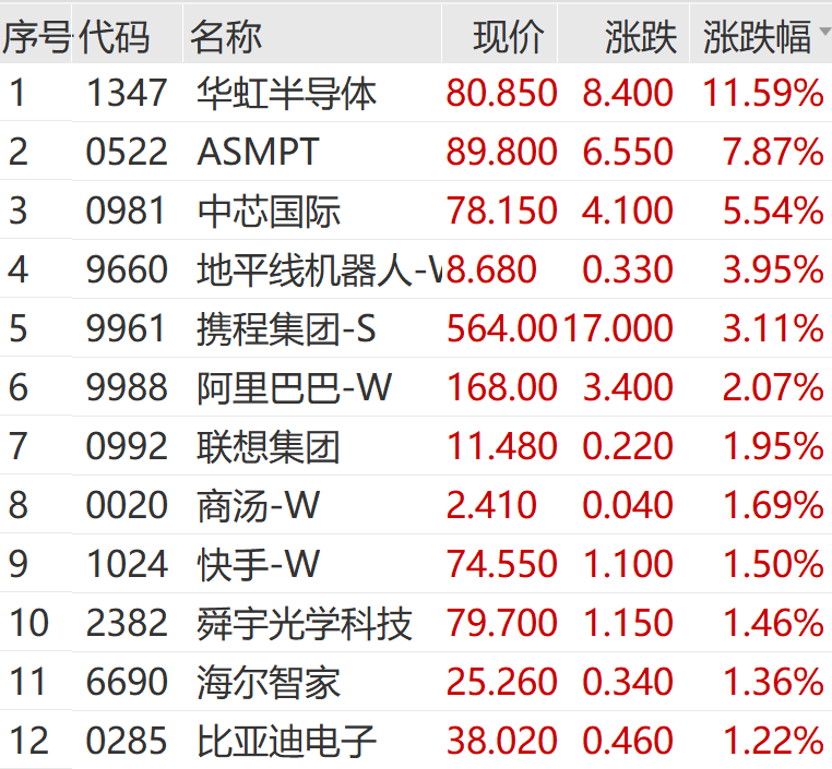 港股市场上午同步飘红,截至午间收盘,恒生指数涨0.59%,恒生科技指数涨1.22%,恒生国企指数涨0.46%;华虹半导体涨近12%,领涨恒生科技指数成份股。