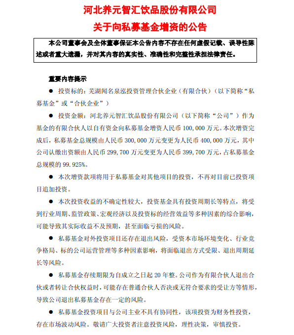 对于这次加码的原因,养元饮品表示,为了对暂时闲置的自有资金进行适度、适时的投资,获得一定的投资收益,进一步提升公司整体业绩水平,为公司和股东谋取更多的投资回报,公司于10月15日与闻名基金签署修订后的《芜湖闻名泉泓投资管理合伙企业(有限合伙)合伙协议》,私募基金募集规模由30亿元变更为40亿元,新增的10亿元出资额由公司认缴。