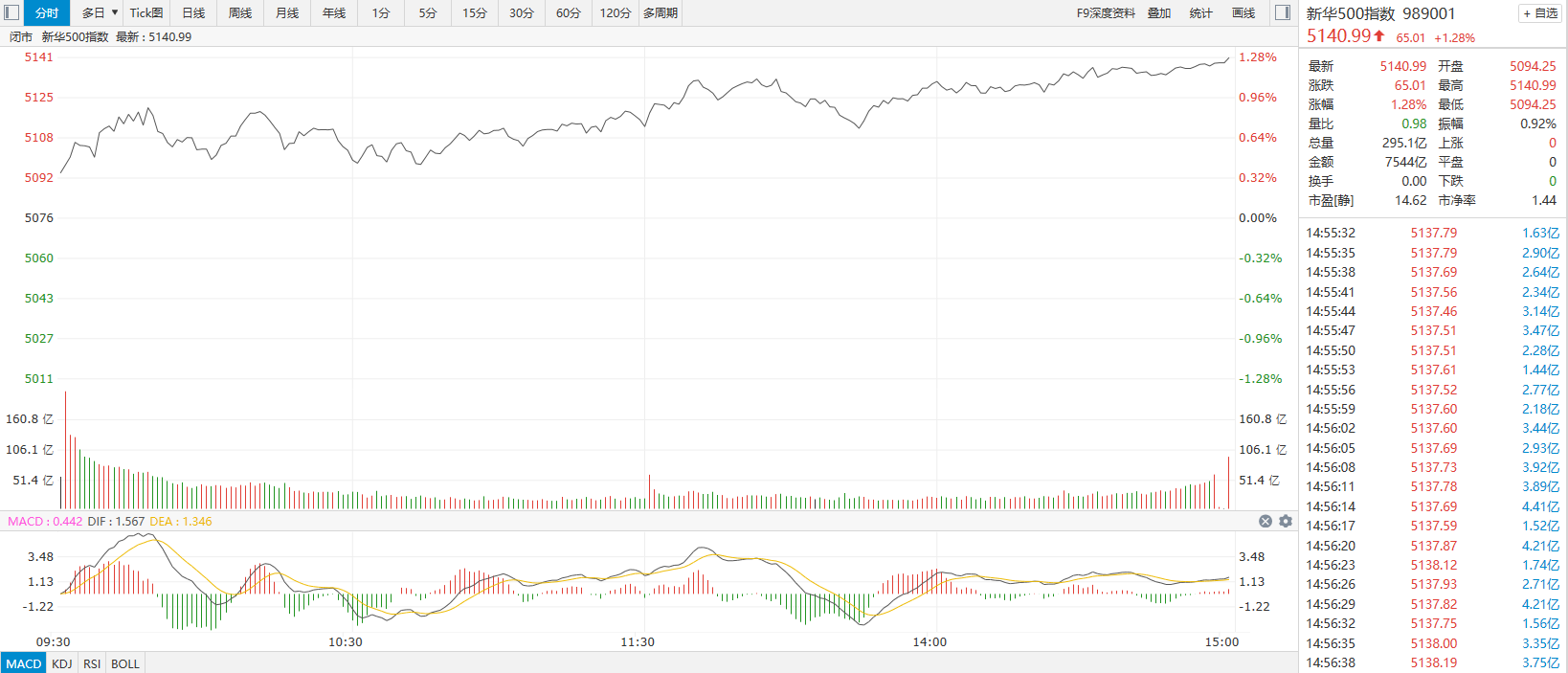 指数盘中最高触及5140.99点,最低触及5094.25点,成分股全天总成交额报7544亿元,总成交额较上一交易日小幅放量。