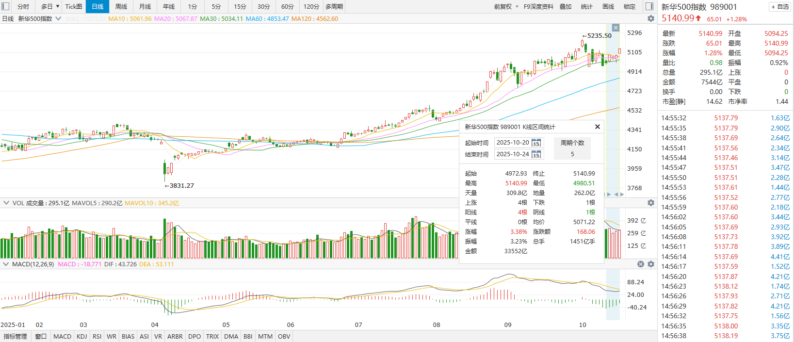 新华500指数本周(2025年10月20日至10月24日)累计上涨3.38%。