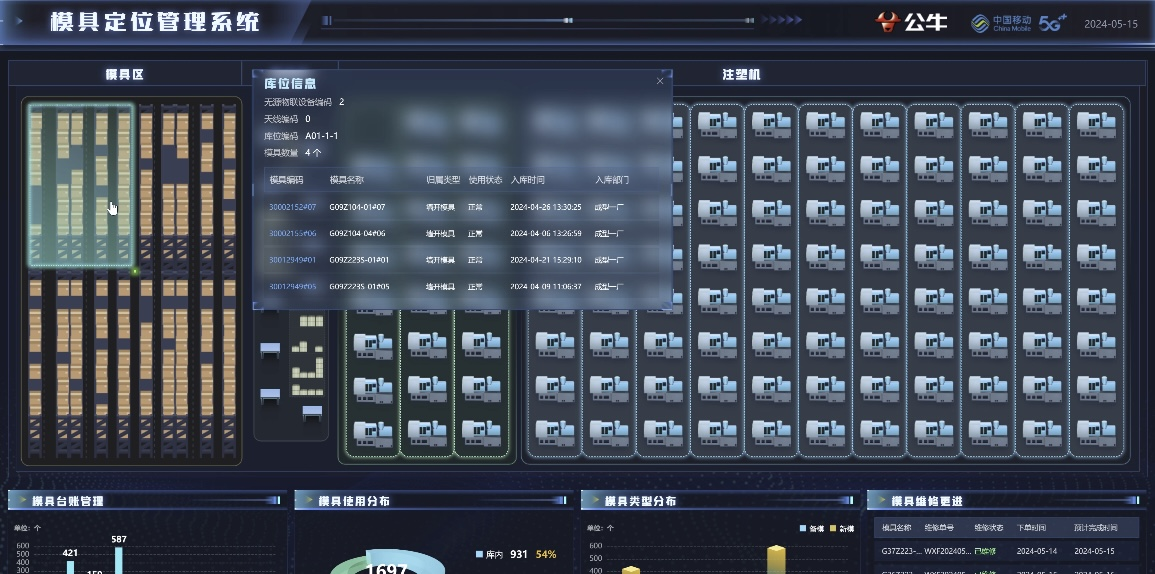 “无源物联不用电源,标签成本低,贴在模具上,通过网络设备就能实时抓取定位、基础信息,管理员找模具更高效。”浙江移动宁波分公司项目经理介绍,依托5G-A网络连续覆盖和海量标签高效识别,结合公牛模具管理系统,实现高精度自动盘点、3-5米精度定位,每年降低管理成本超200万元,彻底告别人工盘点效率低、误差大的难题。