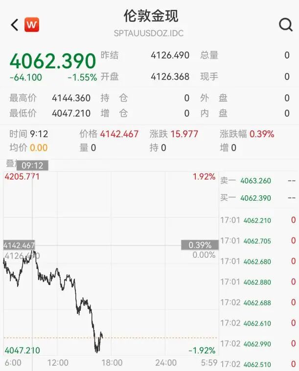 截至发稿,现货黄金报4062.39美元/盎司,日内跌1.55%。