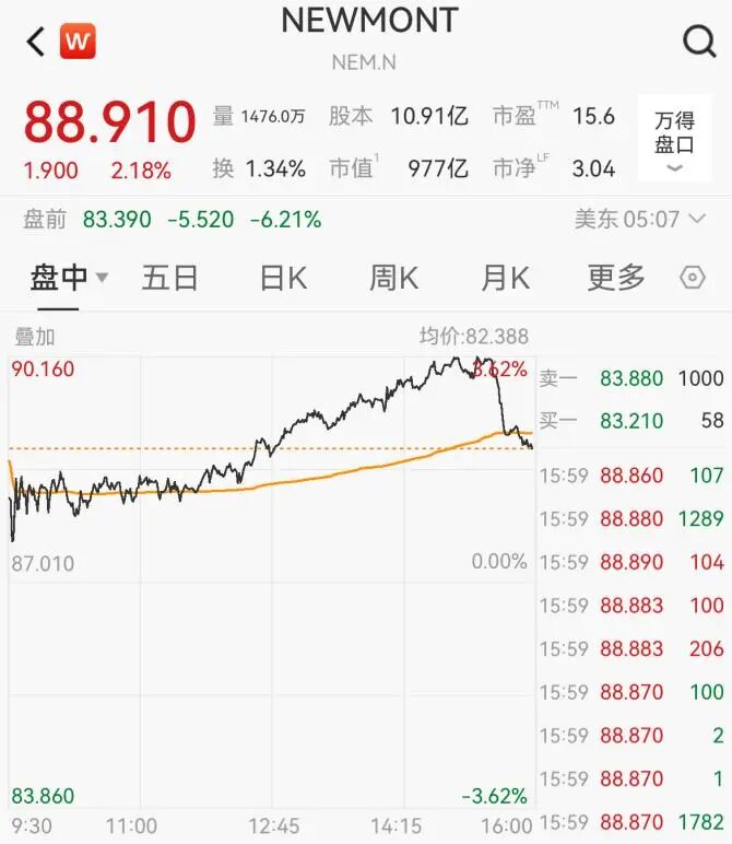 个股方面,纽蒙特矿业(NEM.N)盘前跌6.21%。