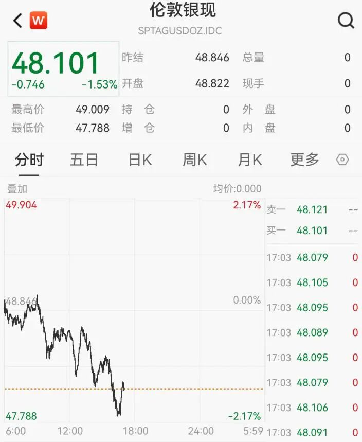 同时,现货白银日内一度跌超2%,现报48.101美元/盎司。