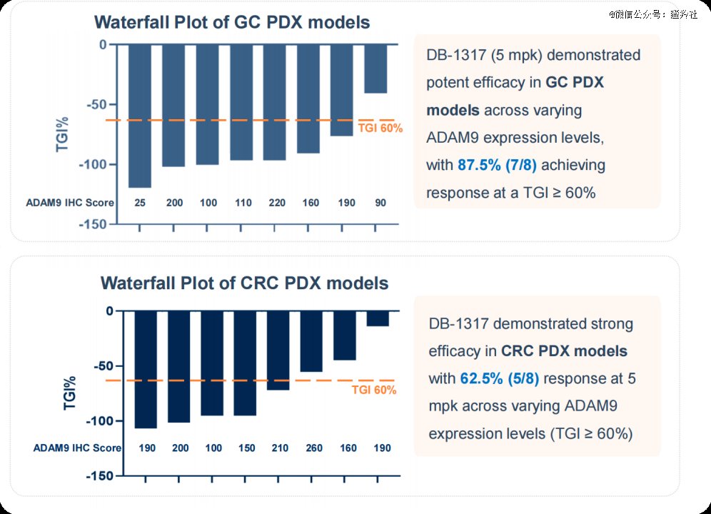 目前PDX模型中,DB-1317的数据还是比较惊艳的,胃癌模型里面,87.5%的个体实现了TGI≥60,而肠癌模型中这个数字也达到了62.5%。