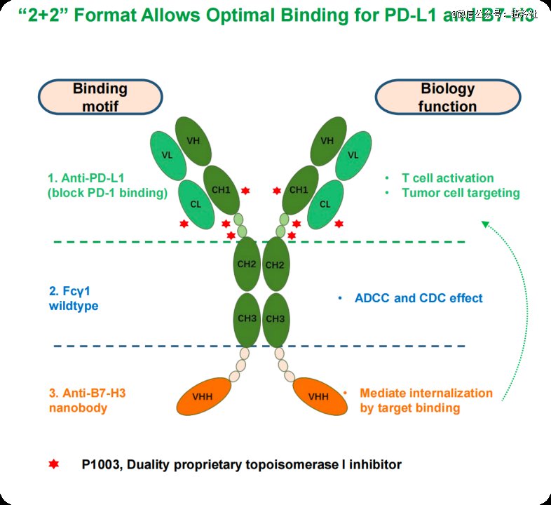然后是双抗ADC,映恩首先提到的是DB-1419,一款靶向B7-H3和PD-L1的双抗ADC,用的是P1003 payload,DAR值达到了8,抗体方面是非常典型的四价设计,一面激活T细胞,一面介导抗体内化。此外,它的ADCC和CDC效应也会对肿瘤细胞杀伤加分。