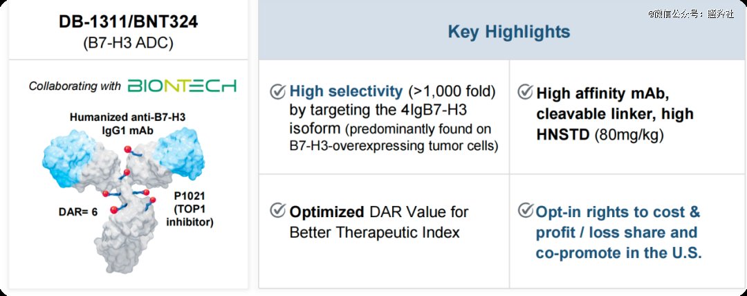 临床管线上,笔者认为差异化的点和映恩这边做的PPT透露的信息还是较为接近的,映恩在临床管线的差异化上,首先非常重点地介绍了B7-H3 ADC。如图所示,众所周知,现在映恩几条主要的ADC当中,主要搭载两种payload,一种是P1003,一种是P1021,在映恩前面主要的四条管线里,除了her2 ADC用的是P1003,剩下的三条ADC用的都是P1021,并且DB-1311把DAR值设定成了6,从结果来看有比较好的优化治疗窗口作用,它的HNSTD(最高非严重毒性剂量)达到了80mg/kg。并且该ADC的抗体有着非常好的选择性(>1000倍)。