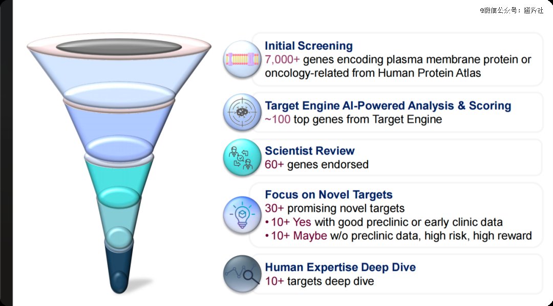 DBNexus是非常不错的靶标识别平台。初始筛选上,先初筛出人类蛋白质图谱中7000多个编码质膜蛋白或肿瘤相关蛋白的基因;然后通过AI驱动的对靶标的分析与评分,从几千个靶点中筛选出大约100个评分最高的基因。然后经过科学家评测,得到60个左右的靶标,最后从这60个左右的靶标中得到30个左右有前景的靶标,其中十个有较大确定性会有较好的临床前和早期临床数据。而另外,专家们也会选择10个左右的靶点去深度分析与验证。