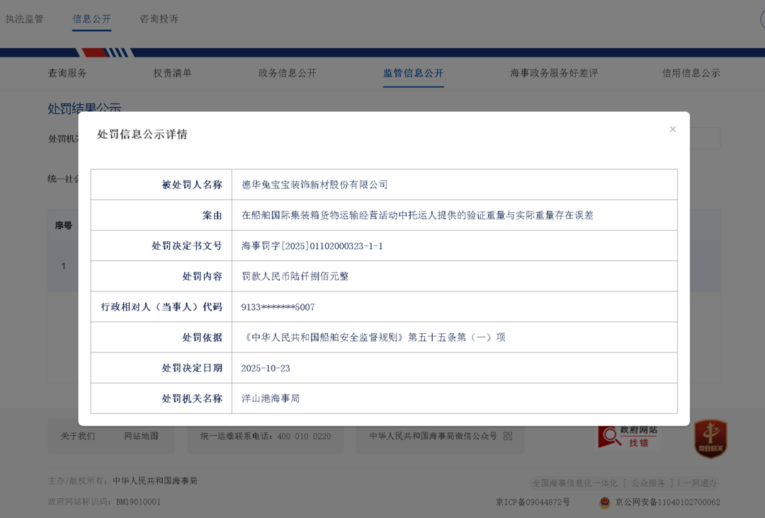 近日,齐鲁晚报·齐鲁壹点记者从中华人民共和国海事局官网处罚结果公示一栏中获悉,德华兔宝宝装饰新材股份有限公司(兔宝宝 002043)因在船舶国际集装箱货物运输经营活动中托运人提供的验证重量与实际重量存在误差,被洋山港海事局罚款人民币陆仟捌佰元整。