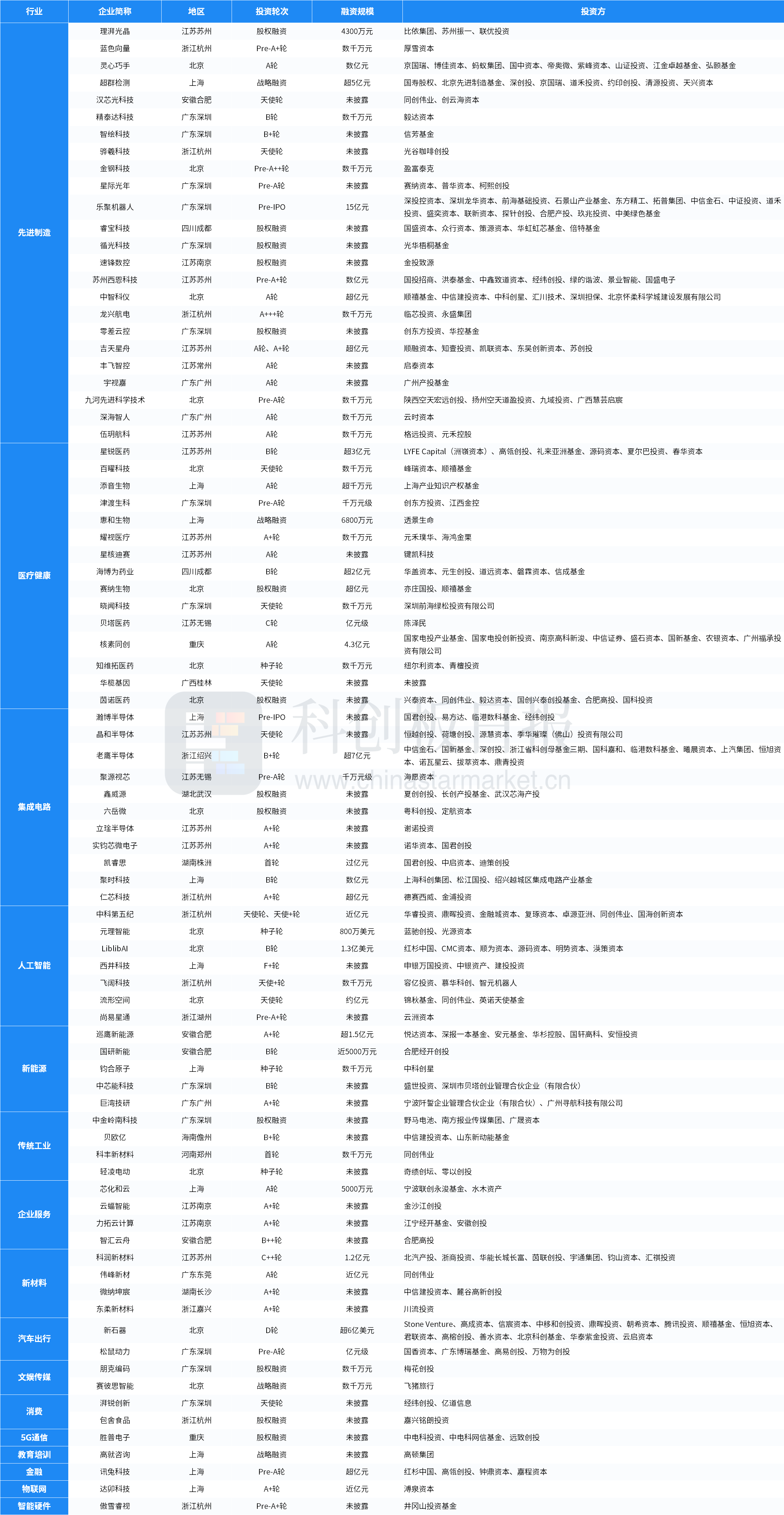 从投资事件数量来看,本周先进制造、医疗健康、集成电路、人工智能、新能源等领域较活跃;从融资总额来看,汽车出行披露的融资总额最多,约43.78亿元。新石器完成由阿联酋磊石资本(Stone Venture)领投,高成投资、信宸资本、鼎晖VGC、朝希资本、北京市人工智能产业投资基金及某互联网公司联合领投,君联资本、高榕创投、善水资本、恒旭资本、亦庄科创二期基金、华泰天府数智基金、云启资本等共同参与的超6亿美元D轮融资,为本周披露金额最高的投资事件。