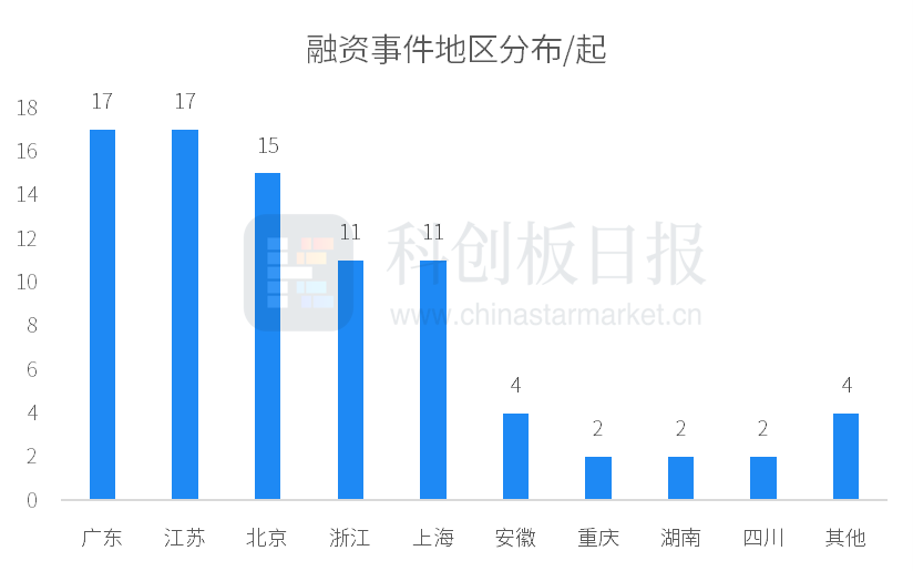 从地区来看,本周广东、江苏、北京、浙江、上海等地公司较受青睐,融资事件数均在10起以上;广东、江苏以17起融资活跃度并列第一。从单个城市看,北京有15家公司获投,居首位;深圳紧随其后,有13家公司获投。