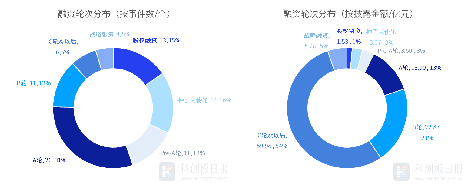 从投资轮次来看,除股权融资外,本周A轮融资事件数最多,发生26起,占比约31%;其次是种子天使轮,发生14起,占比约16%。从各轮次获投金额来看,C轮及以后披露的融资总额最高,约59.98亿元;其次是B轮,约22.87亿元。