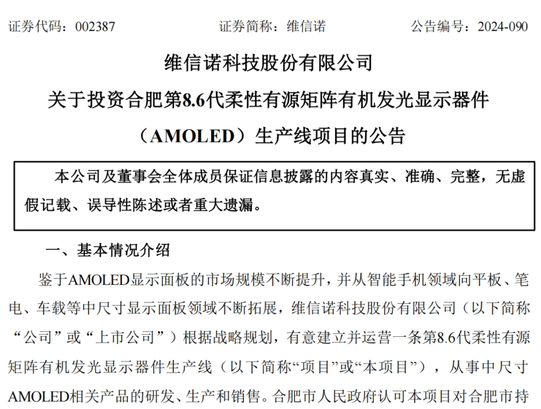 尽管如此,公司仍在押注新产线。2024年,维信诺宣布与合肥建翔投资有限公司、合肥鑫城控股集团有限公司两家国资公司合作建设第8.6代柔性AMOLED生产线,项目总投资额达550亿元,其中股权投资为330亿元、债务融资为220亿元。