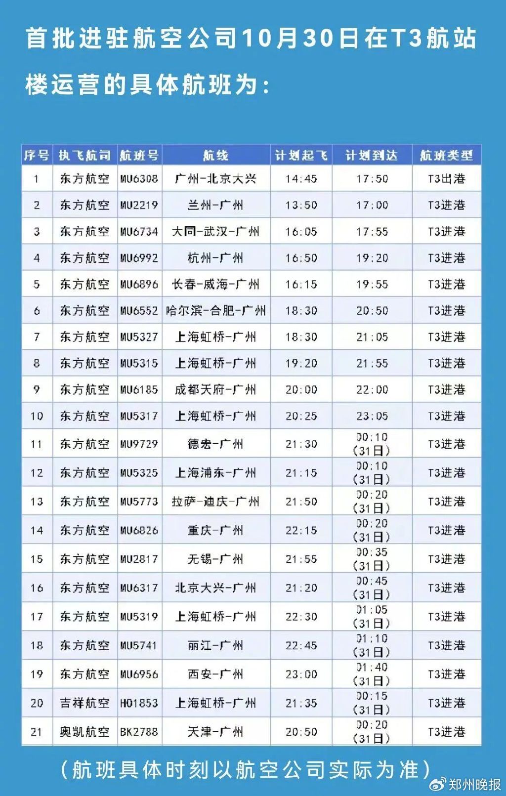 广州白云机场新建T3航站楼将于10月30日正式启用,东方航空、上海航空、中国联合航空、吉祥航空、奥凯航空将首批入驻。其中,东航国际航班暂时保留在T1航站楼运营。