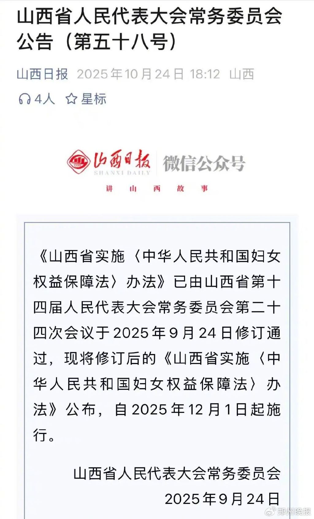 10月24日,山西明确发布:禁止诋毁、侮辱大龄未婚女性,禁止歧视、虐待生育女婴或者残疾婴儿的妇女以及不育妇女;妇女享有与男性平等的继承权。
