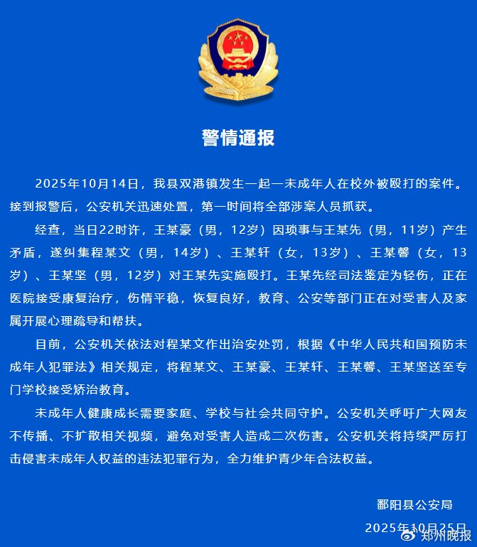5名未成年人在校外殴打11岁男生,10月25日,江西警方通报:1人被治安处罚,5人接受矫治教育。