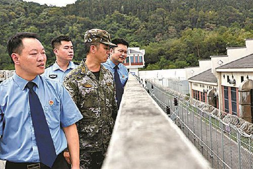 图①:驻监检察室检察官与监狱干警和驻监武警官兵一起查看监区安全保卫工作。