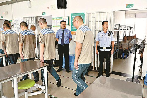 图⑦:检察官与监狱干警一同查看监室情况。
