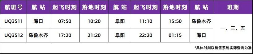 10月27日起乌鲁木齐航空计划新开海口⇋阜阳⇋乌鲁木齐航线