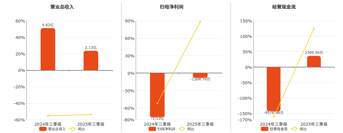 公司营业总收入为2.13亿元,较去年同报告期营业总收入减少2.49亿元,同比较去年同期下降53.88%。归母净利润为-1304.79万元。经营活动现金净流入为2395.54万元。