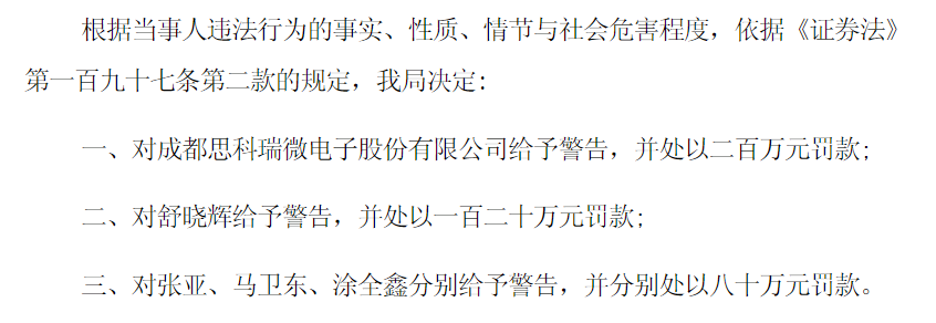 基于上述违法事实,四川证监局决定,对ST思科瑞给予警告并处以200万元罚款,对相关责任人分别处以80万元至120万元不等的罚款。