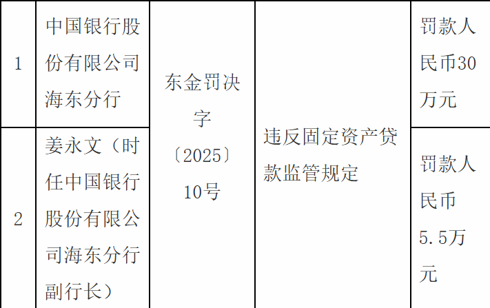 10月24日,国家金融监督管理总局海东监管分局行政处罚信息公开表显示,中国银行股份有限公司海东分行因违反固定资产贷款监管规定被罚款人民币30万元;时任中国银行股份有限公司海东分行副行长姜某文被罚款人民币5.5万元。