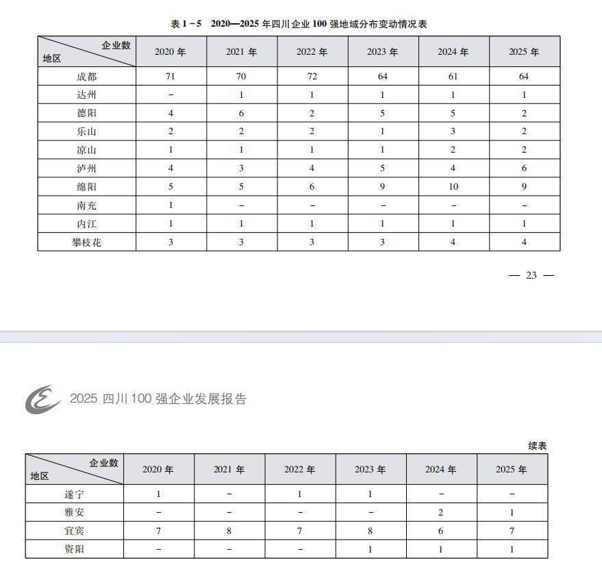 地域之间的竞争同样激烈。从地域分布来看,100强企业地域分布主要集中在成都,2021年至2025年,成都地区上榜企业数量分别为70家、72家、64家、61家、64家。