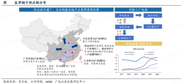 资料来源:汇正研究所盐津贴近源头建厂,依托“研发-试产-试销-量产”的“实验工厂”模式提高产品布局胜率,新品成功率提升至 65%(行业平均约 30%),研发赋能创新迭代下提升弯道超车概率。