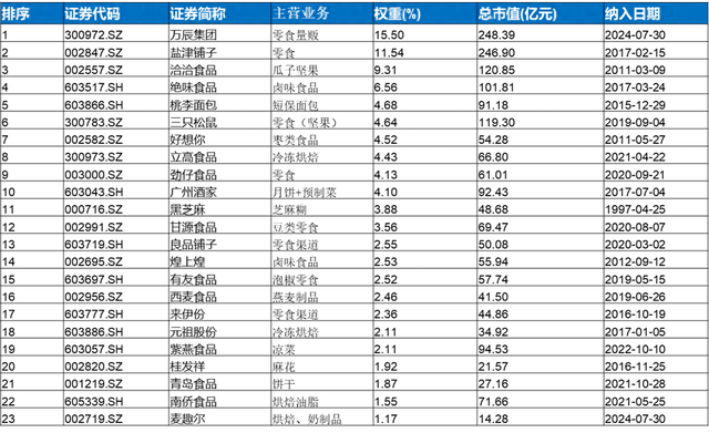 申万休闲食品板块 23 家公司中,2024年新进成分股——万辰集团以 15.5% 的权重位居榜首,总市值 248 亿,其次是盐津铺子和洽洽食品。(完整名单见下表)。