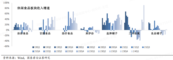产品型公司相对稳健:盐津铺子、劲仔食品业绩增长最快,洽洽食品业绩增速平缓;