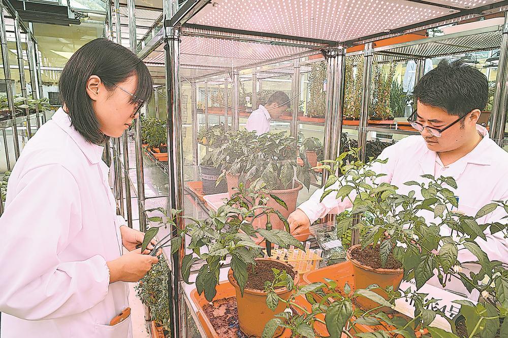 福建农林大学通过多种方式提升学生专业技能。图为10月14日,该校智慧农业实验室内,学生对种植的辣椒进行采样检测。本报记者 游庆辉 摄