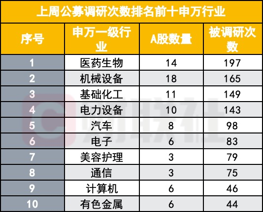 从上周调研数据来看,本轮公募调研的显著特点之一便是强度与集中度齐升。从被调研的个股来看,机械设备、医药生物、电力设备与基础化工四大行业占据核心位置。